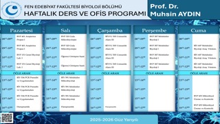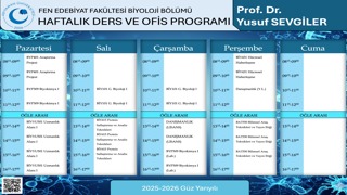 2025-2026 Güz Yarıyılı Biyoloji Bölümü Öğretim Üyeleri Ders ve Ofis Saatlerine aşağıda yer alan kişisel programlar üzerinden erişebilirsiniz.