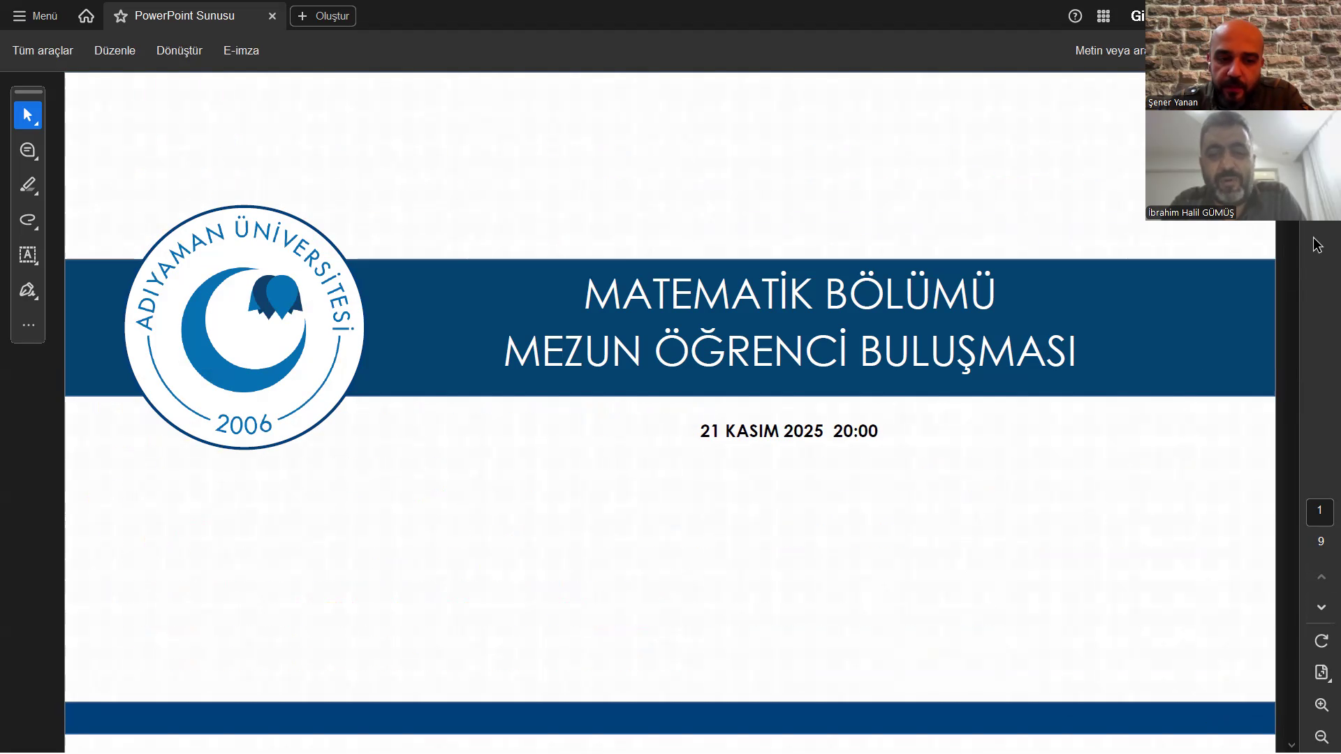 Matematik Bölümü Mezun Öğrenci Buluşması 21 Kasım 2025 20:00'da çevrimiçi zoom platormu üzerinden gerçekleştirilmiştir. Etkinliğe katılan herkese teşekkür ederiz.