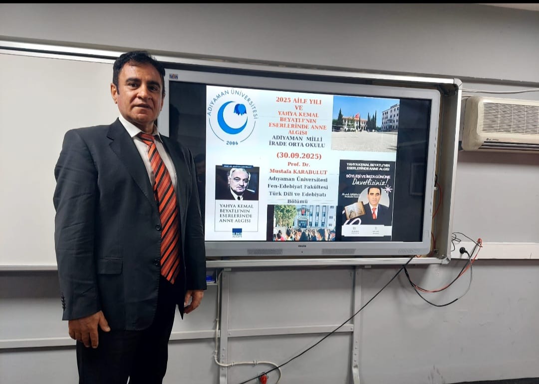 Adıyaman Üniversitesi Fen-Edebiyat Fakültesi Türk Dili ve Edebiyatı Bölümü öğretim üyesi Prof. Dr. Mustafa Karabulut, 30 Ekim 2025 tarihinde “2025 Aile Yılı” etkinlikleri kapsamında Adıyaman Milli İrade Ortaokulu’nda düzenlenen konferansa katıldı. Prof. Dr. Karabulut, konuşmasında aile, çocuk ve toplum ilişkisine değinerek, güçlü aile bağlarının toplumsal yapının temelini oluşturduğunu vurguladı. Ayrıca Yahya Kemal Beyatlı’nın hayatında annesinin önemli rolünden bahsederek, edebiyatın aile değerlerini yansıtma gücüne dikkat çekti. Konferans, öğrencilerin ve öğretmenlerin yoğun ilgisiyle gerçekleşti. Program sonunda Okul Müdürü Hayrullah Erdem, katkılarından dolayı Prof. Dr. Mustafa Karabulut’a teşekkür etti.