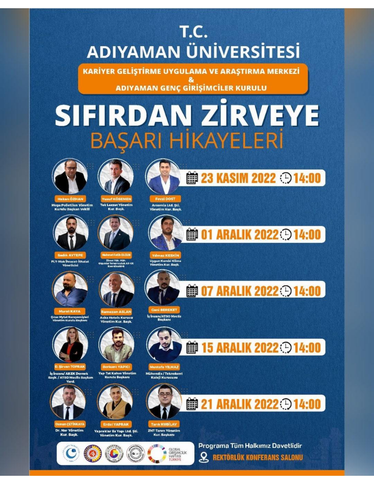Üniversitemiz Kariyer Geliştirme Uygulama ve Araştırma Merkezi ve Adıyaman Genç Girişimciler Kurulu ile ortak düzenlenecek olan "Sıfırdan Zirveye Başarı Hikayeleri" programı Üniversitemiz Rektörlük Konferans Salonunda yapılacak olup, tüm öğrencilerimiz davetlidir.
