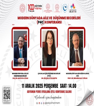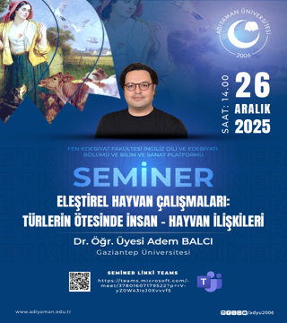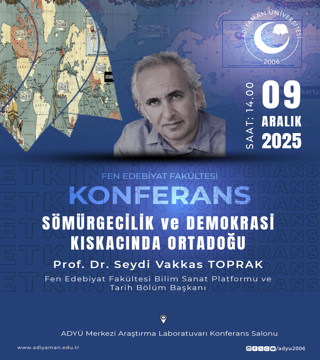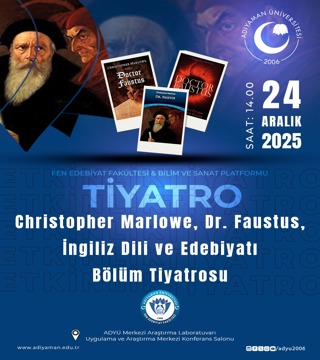 Sömürgecilik ve Demokrasi Kıskacında Ortadoğu09Aralık2025 14:00ADYÜ Merkezi Araştırma Laboratuvarı Konferans SalonuADYÜ 1 Psikoloji Günleri11Aralık2025 10:00ADYÜ Mustafa V. KOÇ KONFERANS SALONUModern Dünyada Aile ve Düşünme Becerileri (P4C) Konferansı11Aralık2025 14:00Adıyaman Perre Uygula Oteli Konferans SalonuErasmus Yolculuğu: Uluslararası Araştırma ve Kültürel Etkileşim16Aralık2025 14:00ADYÜ Merkezi Araştırma Laboratuvarı Konferans SalonuŞanlıurfa Şuayip Şehri ve Halepli Bahçe17Aralık2025 15:30ADYÜ Mediko Sosyal Konferans SalonuStudent Talks VIII19Aralık2025 14:00ADYÜ Merkezi Araştırma Laboratuvarı Konferans SalonuArkeolojide Meslek Pratikleri: Mezunlardan öğrencilere23Aralık2025 13:30Fen Edebiyat Fakültesi Arkeoloji LaboratuvarıChristopher Marlowe, Dr. Faustus, İngiliz Dili ve Edebiyatı Bölüm Tiyatrosu 24Aralık2025 14:00ADYÜ Merkezi Araştırma Laboratuvarı Konferans SalonuEdebiyatta Aile: Türk ve İngiliz Edebiyatlarındaki Yansımalarıyla Aile Sempozyumu25Aralık2025 10:10ADYÜ Mustafa V. Koç Konferans SalonuEleştirel Hayvan Çalışmaları: Türlerin Ötesinde İnsan – Hayvan İlişkileri26Aralık2025 14:00TEAMS (https://teams.microsoft.com/meet/37801607179522?p=rV-yZ0W43isJOXvvvf5)