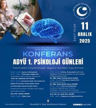 Sömürgecilik ve Demokrasi Kıskacında Ortadoğu09Aralık2025 14:00ADYÜ Merkezi Araştırma Laboratuvarı Konferans SalonuADYÜ 1 Psikoloji Günleri11Aralık2025 10:00ADYÜ Mustafa V. KOÇ KONFERANS SALONU