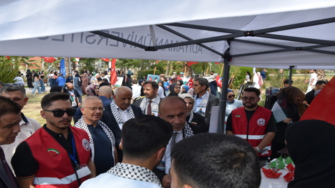 Eğitim Fakültesi önünden Gençlik Meydanı’na yapılan yürüyüşle başlayan program, açılış konuşmaları, ezgi ve şiir dinletileriyle devam etti. Rektörümüz Prof. Dr. Mehmet KELEŞ’in konuşmasının ardından, Gazzeli öğrencimiz Ahmet Coma yaşananları birinci ağızdan aktardı.